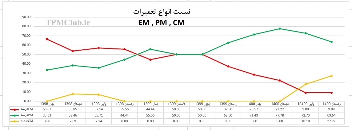 فایل اکسلی را برای شما آماده نموده است که می توانید به راحتی و با ورود اطلاعات مورد نیاز در جدول داده شده، روند شاخص های کلیدی عملکرد نت همچون MTBF، MTBP ، MTBM ، و همچنین روند درصد انواع تعمیرات EM ، PM و CM را مشاهده و تحلیل نمایید.